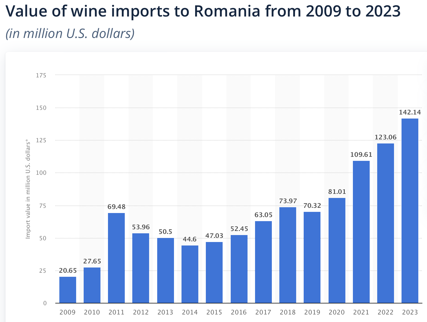 L’ingresso della Romania in Europa nel 2008, e lo scambio culturale con milioni di Romeni presenti nel mondo, hanno portato ad un aumento delle importazioni di vino. Nel 2009 le importazioni di vino sono state stimate intorno ai 20 milioni di euro. Oggi sono stati superati i 150 milioni di euro.